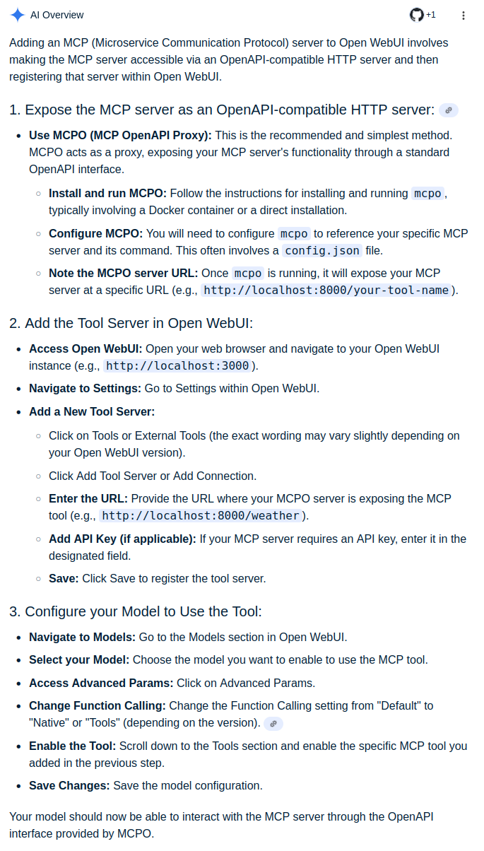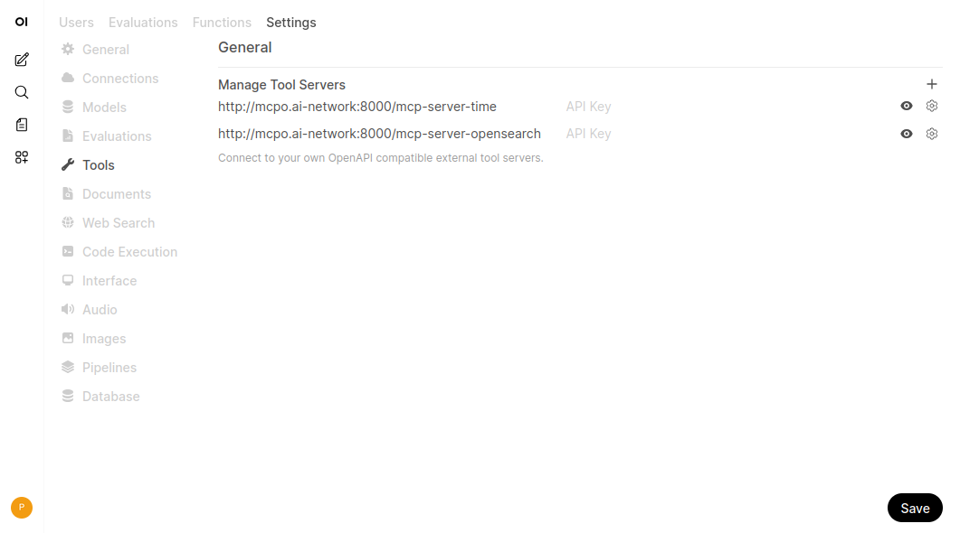 MCP tool settingsWiring up the MCPO gateway to Open-WebUI became significantly more involved at versions 0.6.31. Essentially security of access has become a thing. One can only speculate at what sort of security blunders caused this rethink, which is obviously for the better I must add. The references used currently are
